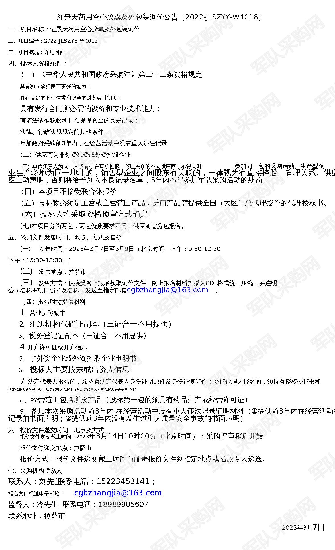【军队采购】军队采购网红景天药用空心胶囊及外包装询价公告(2022-JLSZYY-W4016)(20230307)