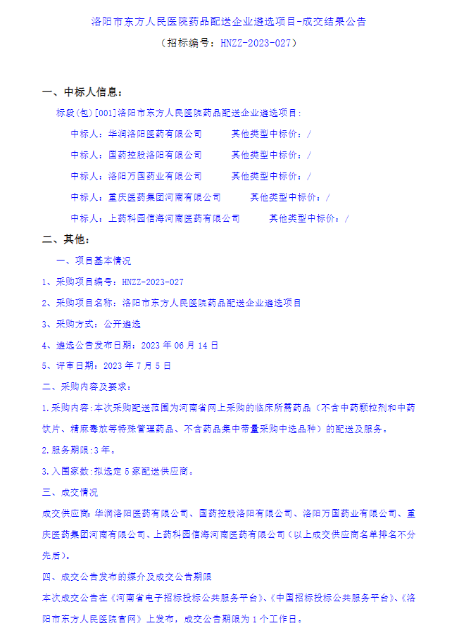 【洛阳市东方人民医院】河南省洛阳市东方人民医院药品配送企业遴选项目-成交结果公告