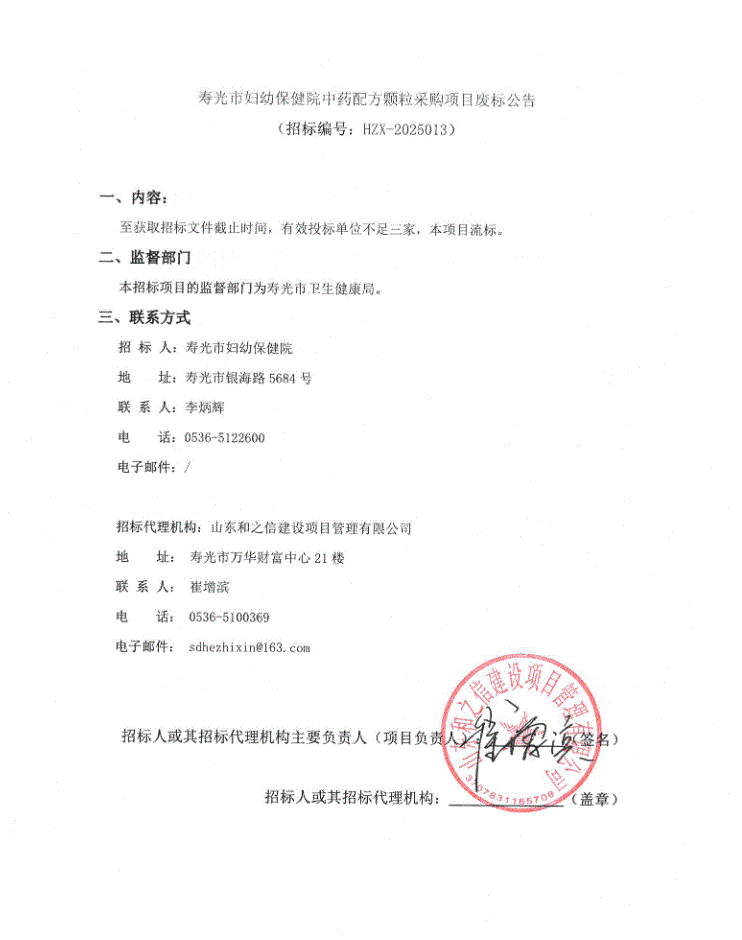 【潍坊市寿光市妇幼保健院】山东省寿光市妇幼保健院中药配方颗粒采购项目废标公告