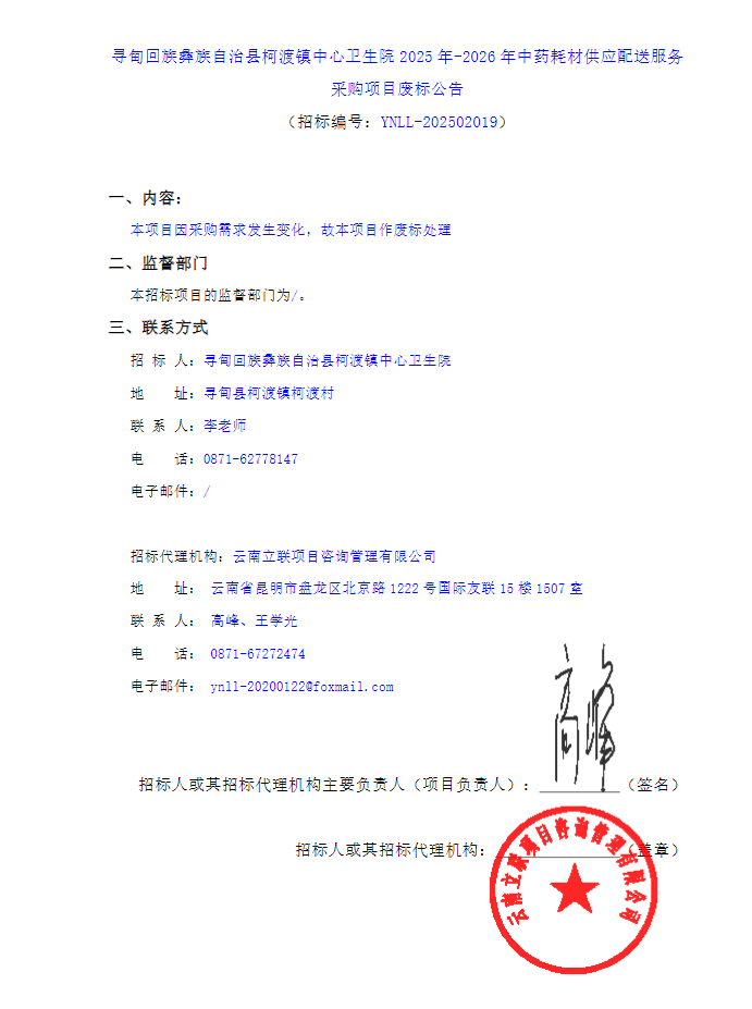 【昆明市寻甸回族彝族自治县柯渡镇中心卫生院】云南省昆明市寻甸回族彝族自治县柯渡镇中心卫生院2025年-2026年中药耗材供应配送服务采购项目废标公告