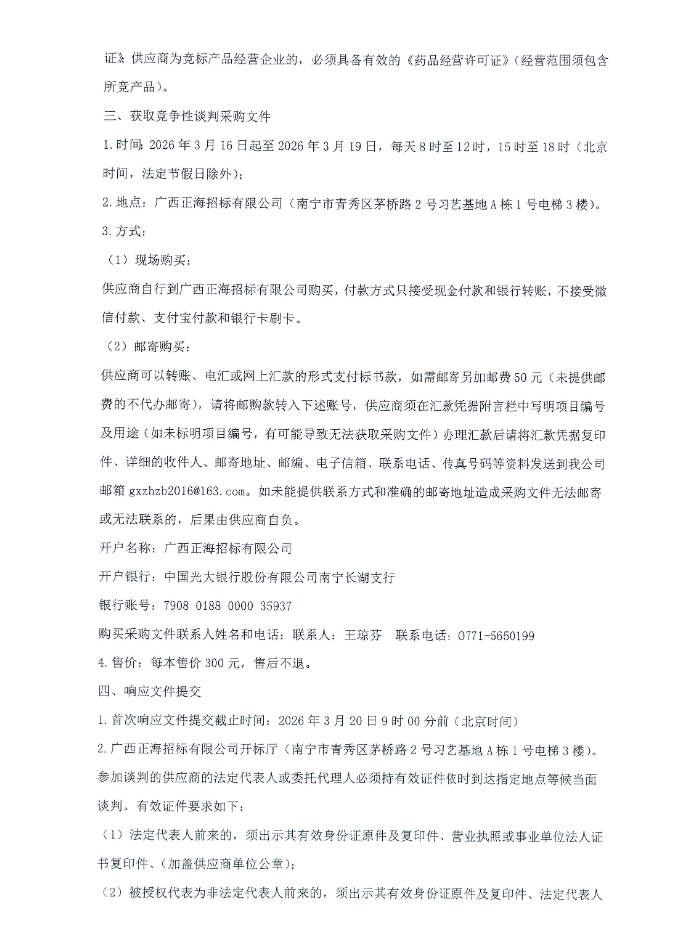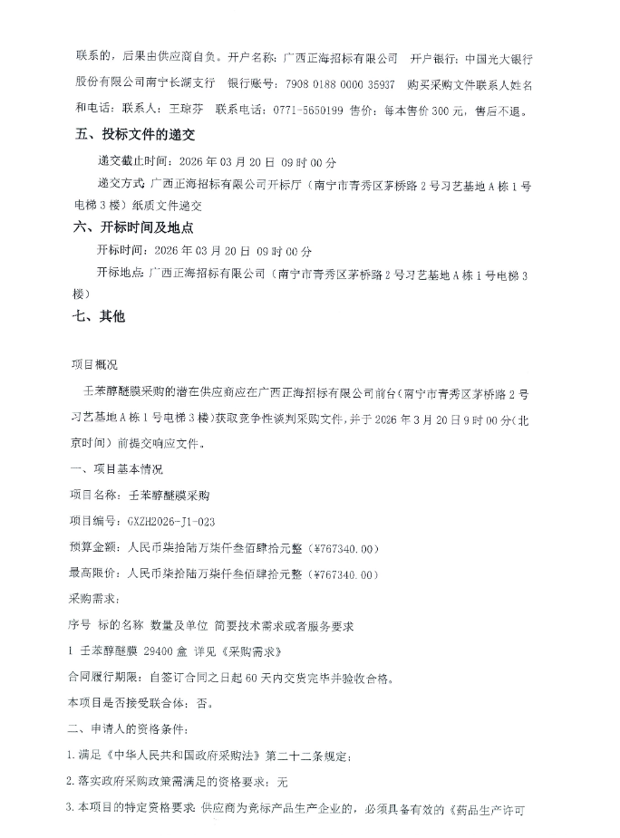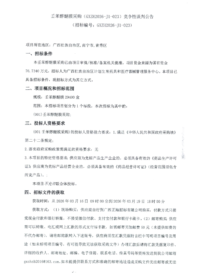 【广西壮族自治区计划生育药具和医疗器械管理服务中心】广西壮族自治区计划生育药具和医疗器械管理服务中心壬苯醇醚膜采购(GXZH2026-J1-023)竞争性谈判公告