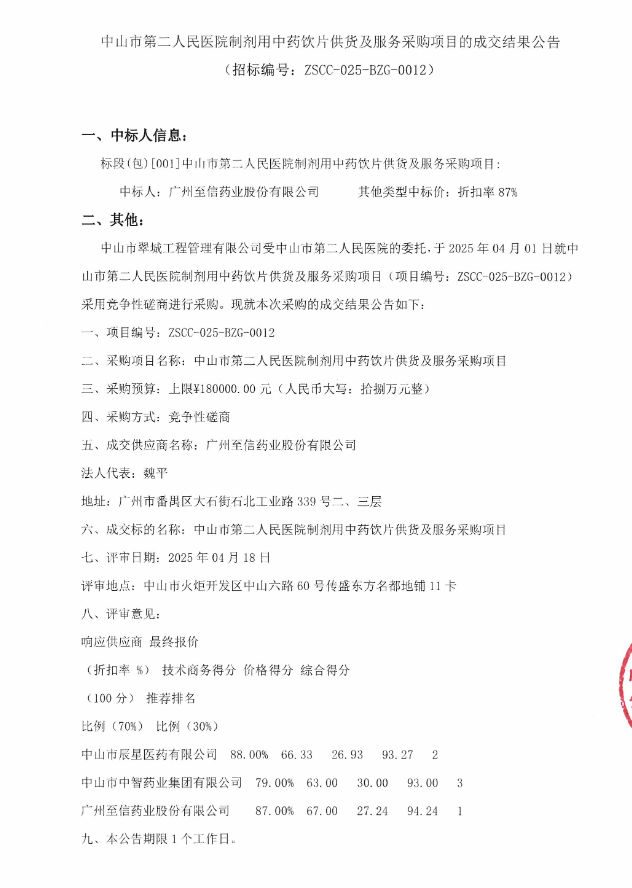 【中山市第二人民医院】广东省中山市第二人民医院制剂用中药饮片供货及服务采购项目的成交结果公告