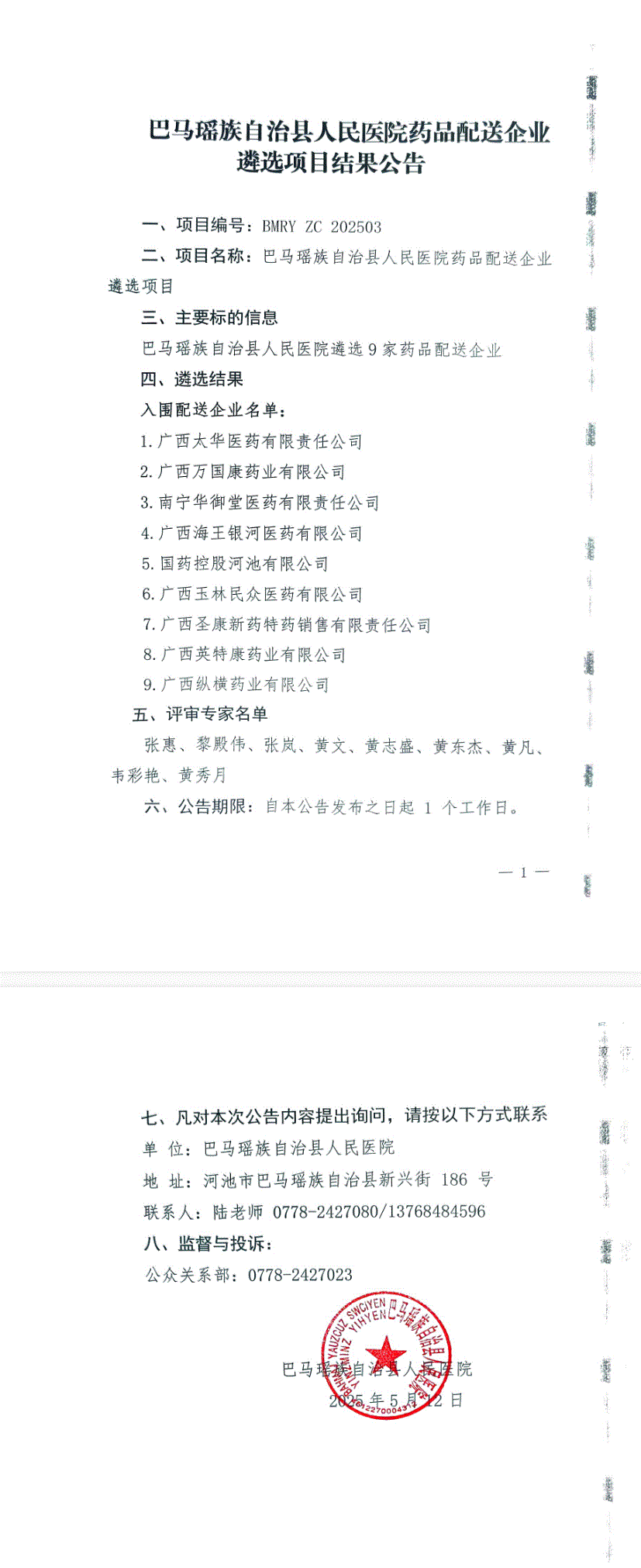 【河池市巴马瑶族自治县人民医院】广西壮族自治区河池市巴马瑶族自治县人民医院药品配送企业遴选结果公告