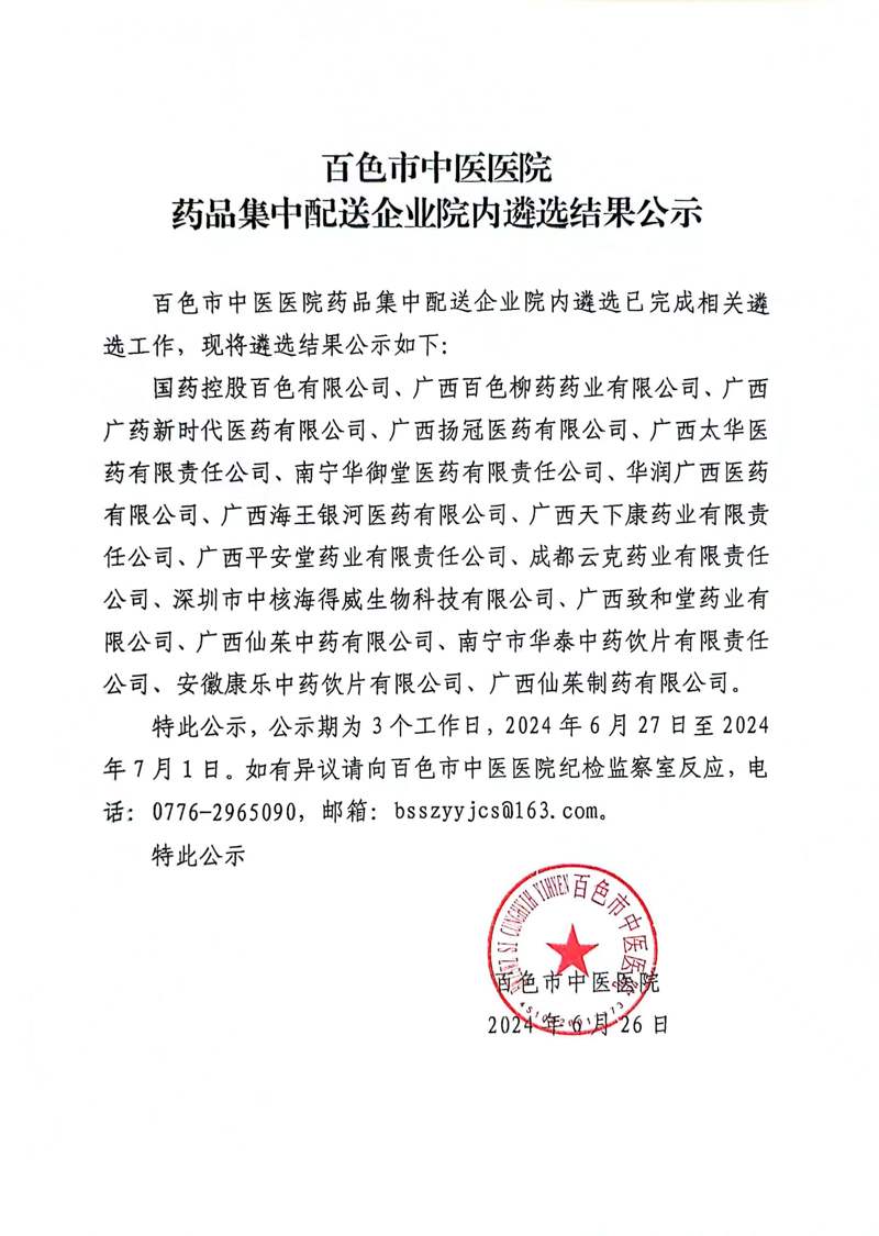 【百色市中医医院】广西壮族自治区百色市中医医院药品集中配送企业院内遴选结果公示(20240627)