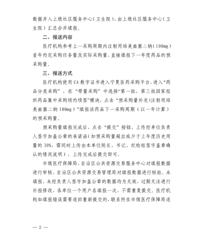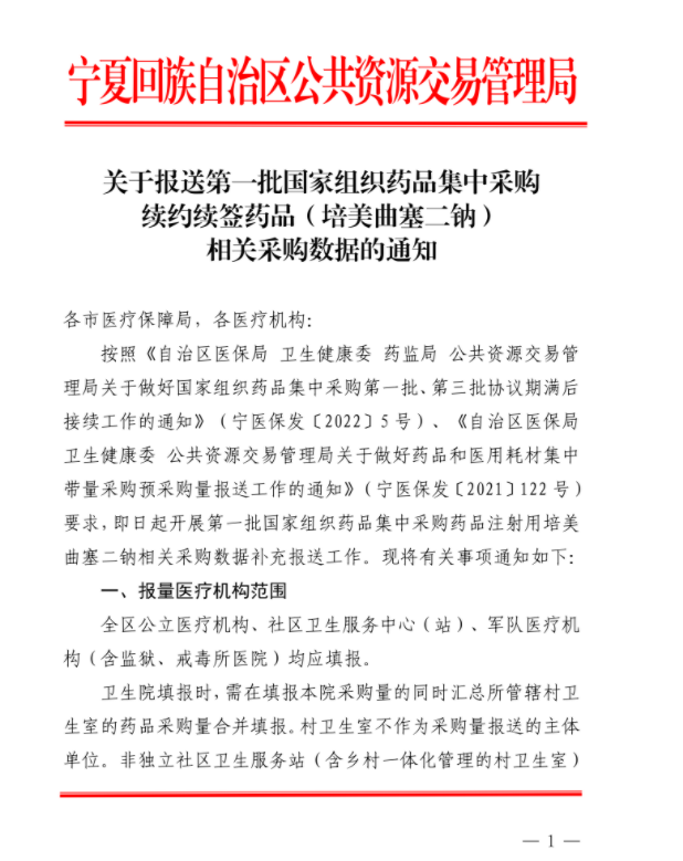 【宁夏】关于报送第一批国家组织药品集中采购续约续签药品(培美曲塞二钠)相关采购数据的通知