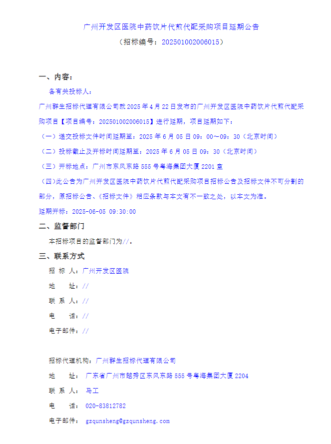 【广州开发区医院】广东省广州开发区医院中药饮片代煎代配采购项目延期公告