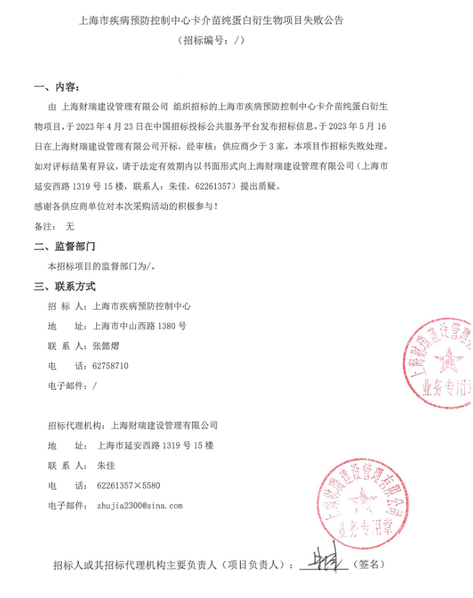 【上海市疾病预防控制中心】上海市疾病预防控制中心卡介苗纯蛋白衍生物项目失败公告