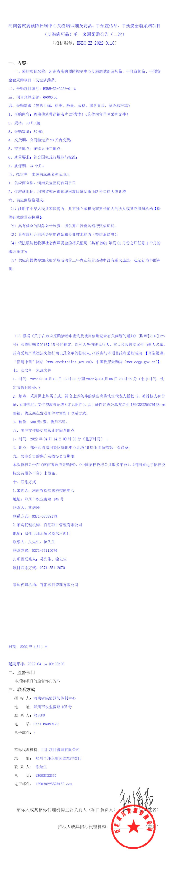 【河南省疾控中心】河南省疾病预防控制中心艾滋病试剂及药品、干预宣传品、干预安全套采购(艾滋病药品)单一来源采购公告(二次)