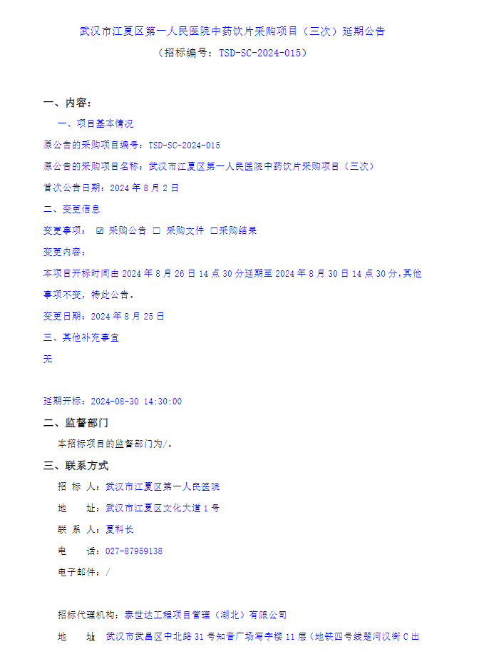 【武汉市江夏区第一人民医院】湖北省武汉市江夏区第一人民医院中药饮片采购项目(三次)延期公告