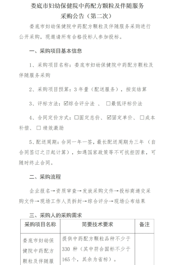 【娄底市妇幼保健院】湖南省娄底市妇幼保健院中药配方颗粒及伴随服务采购公告(第二次)