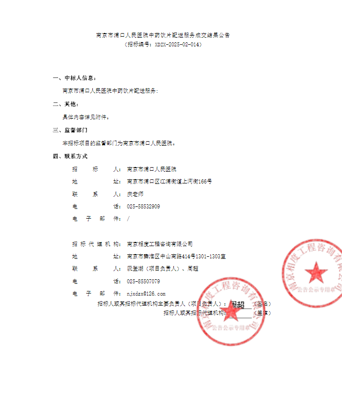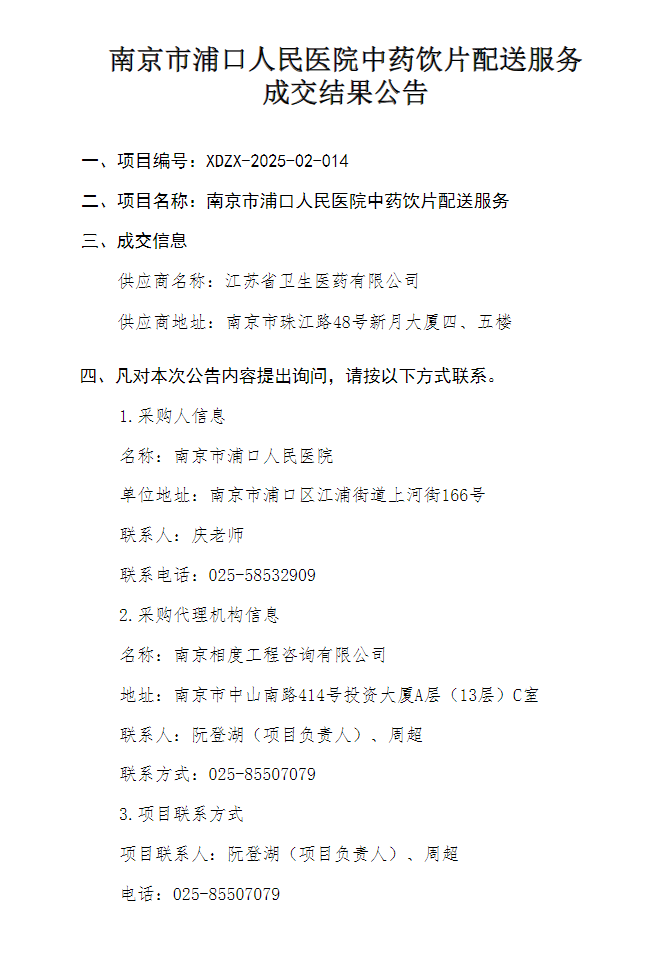 【南京市浦口人民医院】江苏省南京市浦口人民医院中药饮片配送服务成交结果公告