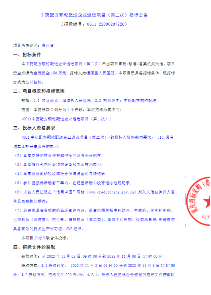 【贵州省遵义市湄潭县人民医院】中药配方颗粒配送企业遴选项目(第二次)招标公告