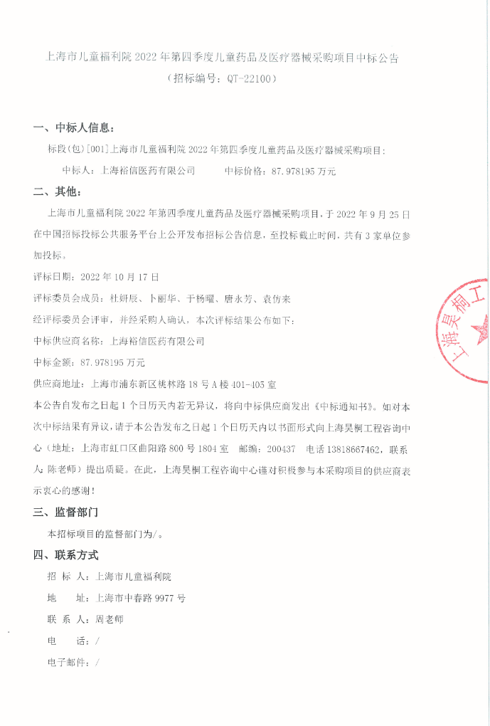 【上海市儿童福利院】2022年第四季度儿童药品及医疗器械采购项目中标公告