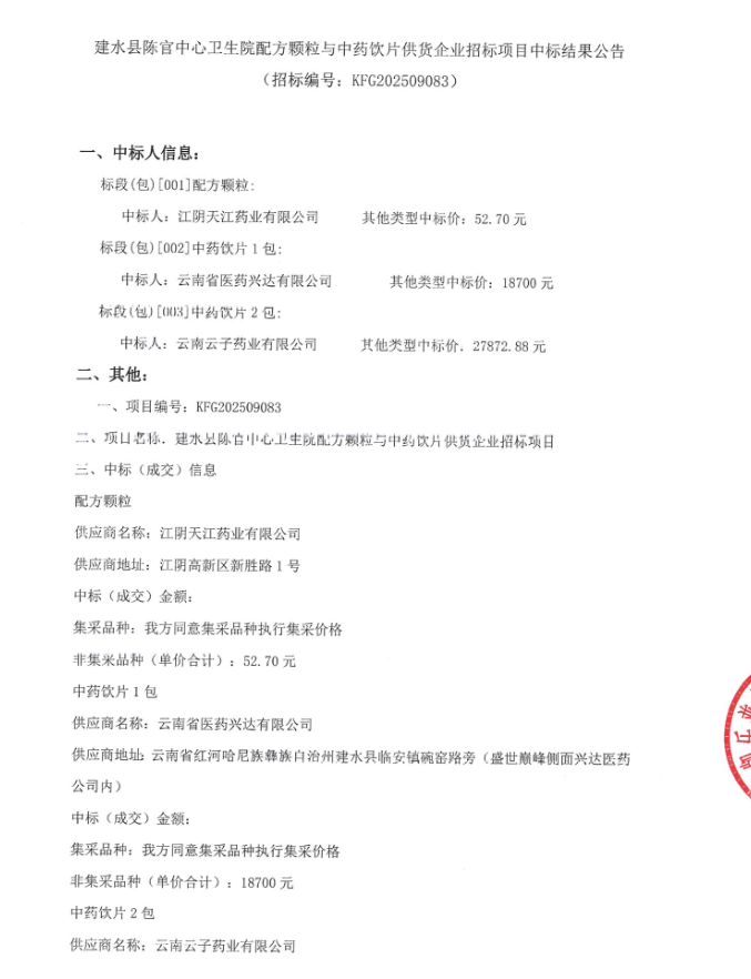 【红河哈尼族彝族自治州建水县陈官中心卫生院】云南省红河哈尼族彝族自治州建水县陈官中心卫生院配方颗粒与中药饮片供货企业招标项目中标结果公告