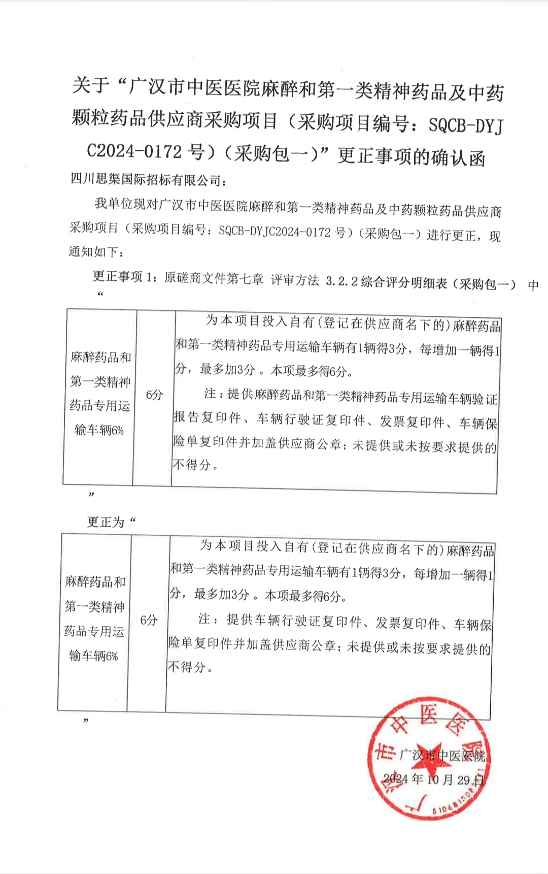 【德阳市广汉市中医医院】四川省德阳市关于“广汉市中医医院麻醉和第一类精神药品及中药颗粒药品供应商采购项目(采购项目编号:SQCB-DYJC2024-0172号)(采购包一)”更正事项的确认函
