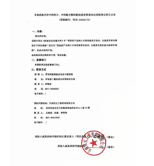 【昆明市寻甸回族彝族自治县中医医院】云南省昆明市寻甸县医共体中药饮片、中药配方颗粒配送服务框架协议采购项目更正公告1