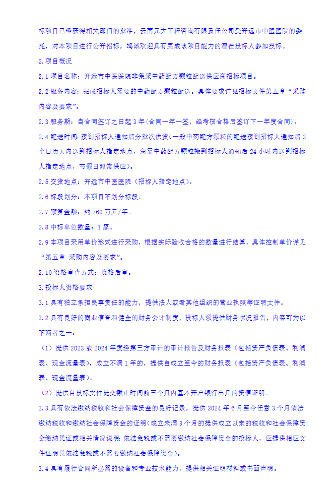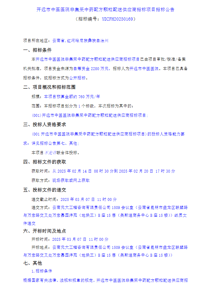 【红河哈尼族彝族自治州开远市中医医院】云南省开远市中医医院非集采中药配方颗粒配送供应商招标项目招标公告