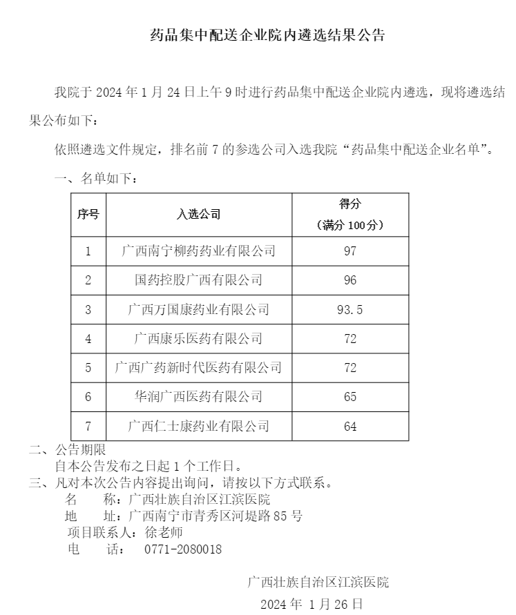 【广西壮族自治区江滨医院】广西壮族自治区江滨医院药品集中配送企业院内遴选结果公告