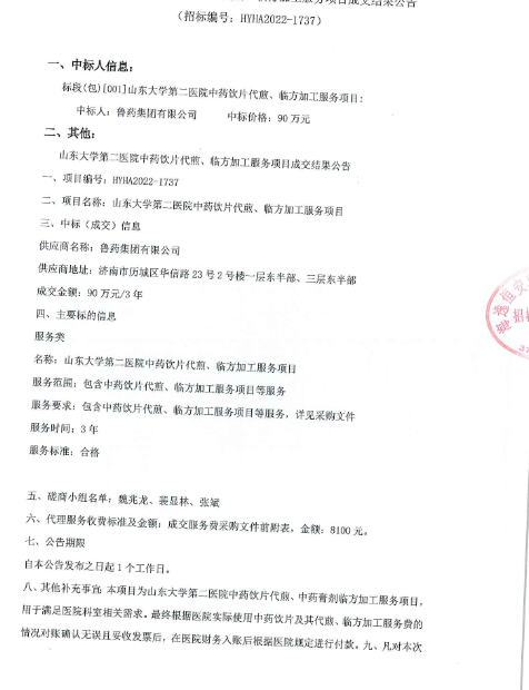 【山东大学第二医院】山东大学第二医院中药饮片代煎、临方加工服务项目成交结果公告