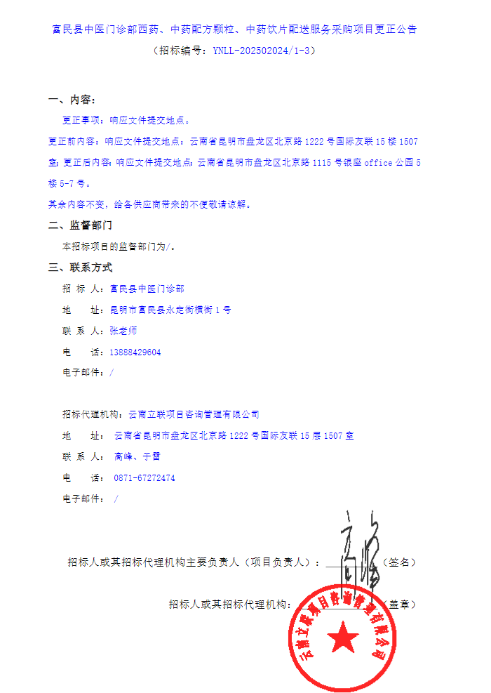 【昆明市富民县中医门诊部】云南省昆明市富民县中医门诊部西药、中药配方颗粒、中药饮片配送服务采购项目更正公告