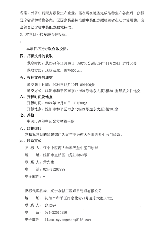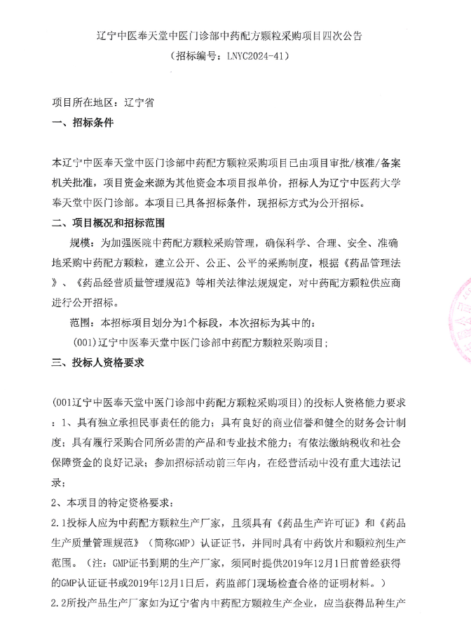 【辽宁中医奉天堂中医门诊部】辽宁中医奉天堂中医门诊部中药配方颗粒采购项目四次公告