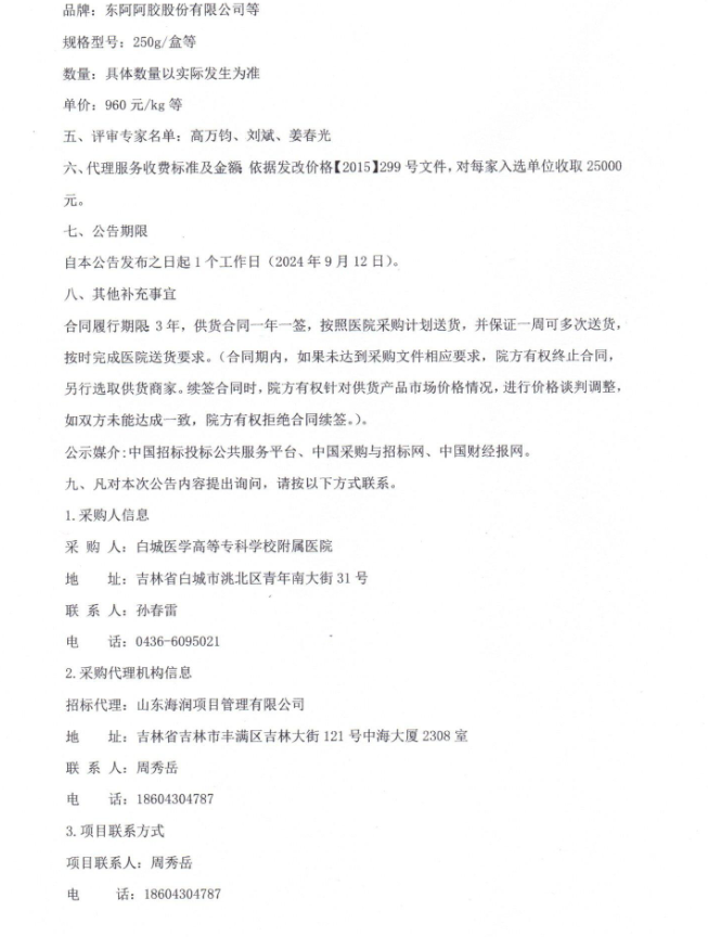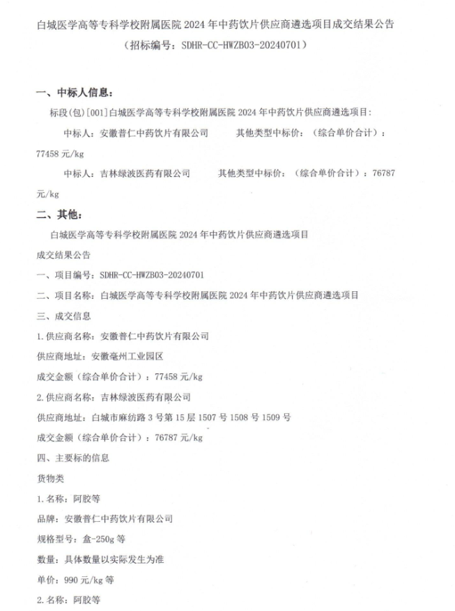 【白城医学高等专科学校附属医院】吉林省白城医学高等专科学校附属医院2024年中药饮片供应商遴选项目成交结果公告