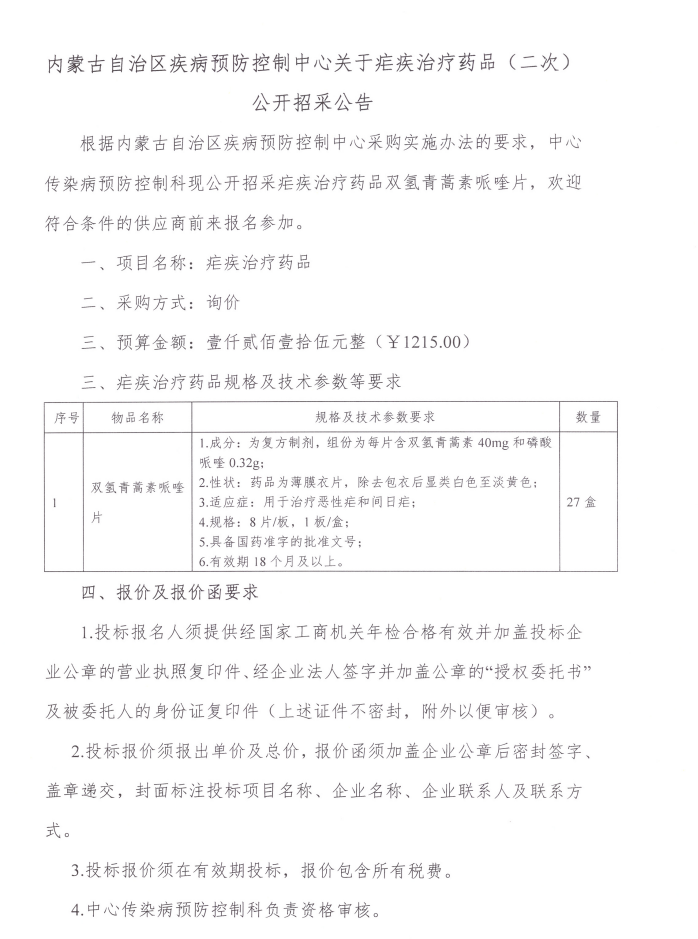 【内蒙古自治区疾病预防控制中心】内蒙古自治区疾病预防控制中心关于疟疾治疗药品(二次)公开招采公告