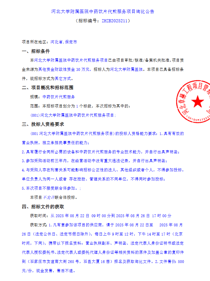 【河北大学附属医院】河北大学附属医院中药饮片代煎服务项目询比公告