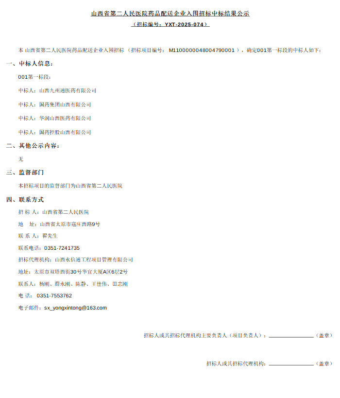 【山西省第二人民医院】山西省第二人民医院药品配送企业入围招标招标公告的中标结果公告