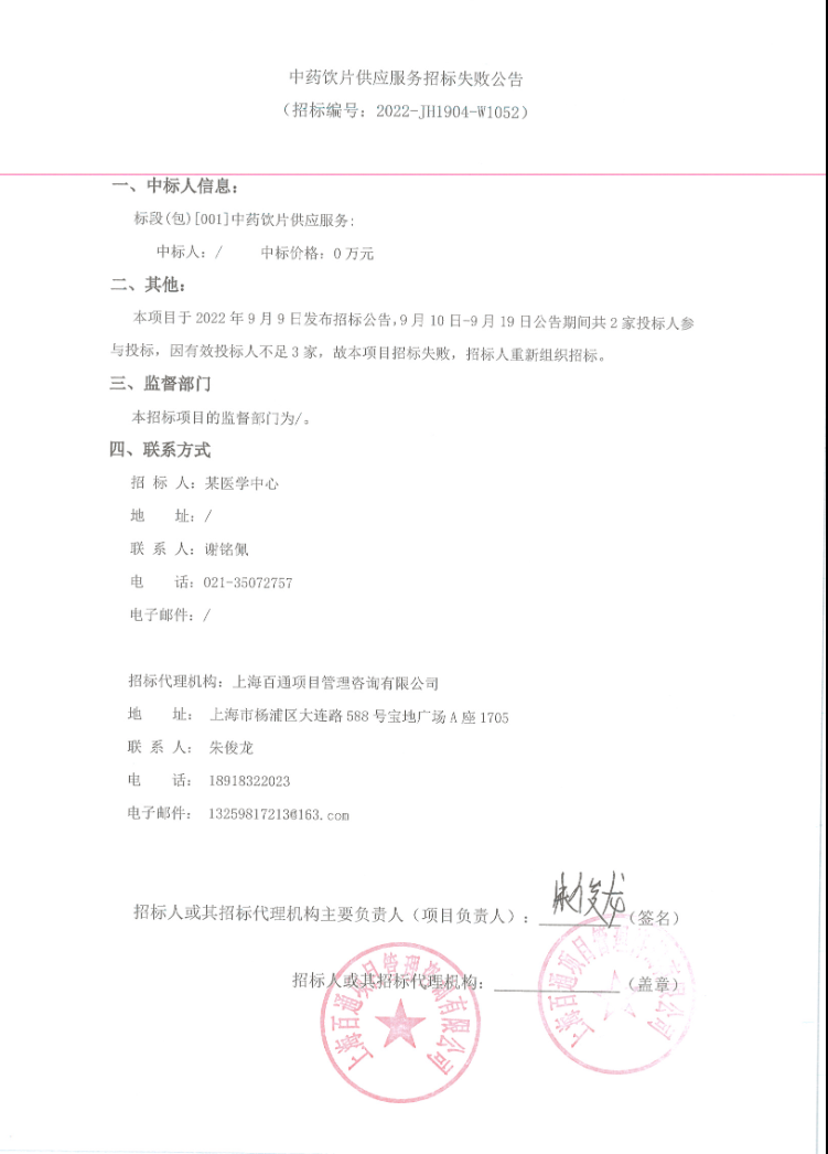 【上海市某医学中心】中药饮片供应服务招标失败公告