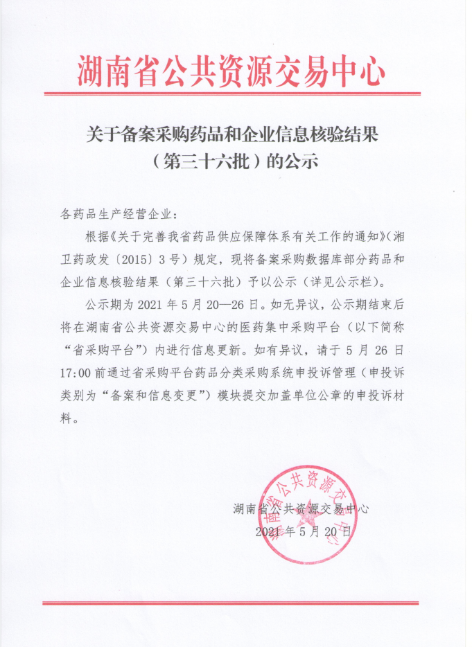 【湖南】2021年湖南省关于备案采购药品和企业信息核验结果(第三十六批)的公示