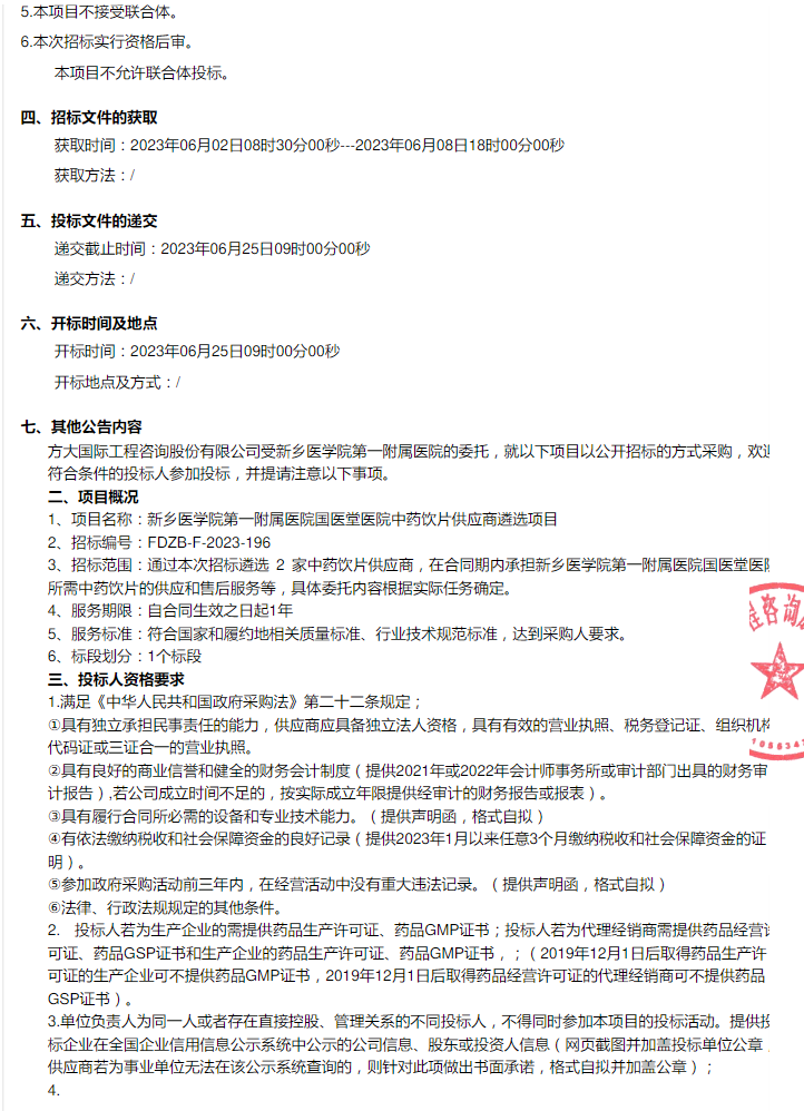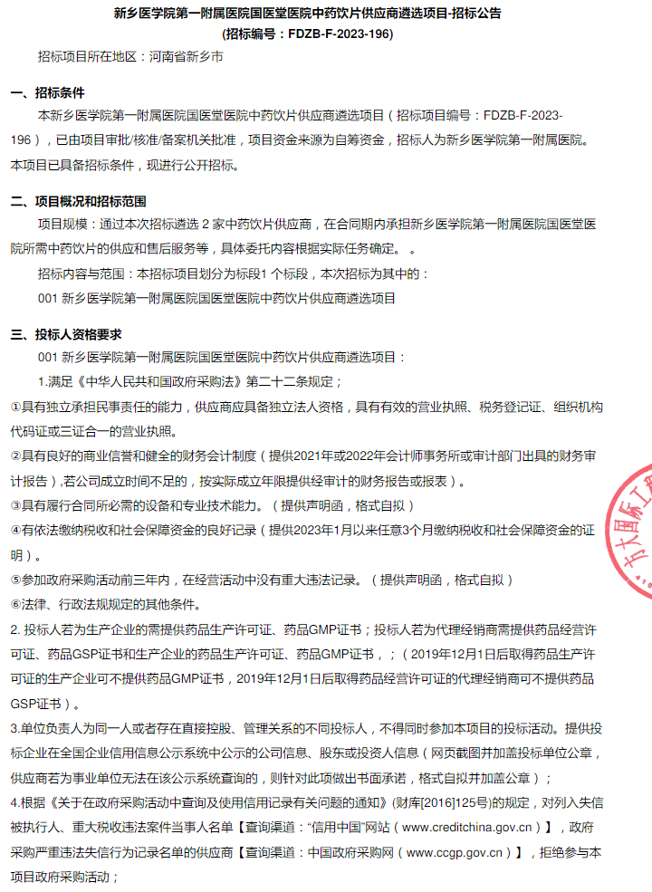 【新乡医学院第一附属医院】河南省新乡医学院第一附属医院国医堂医院中药饮片供应商遴选项目-招标公告