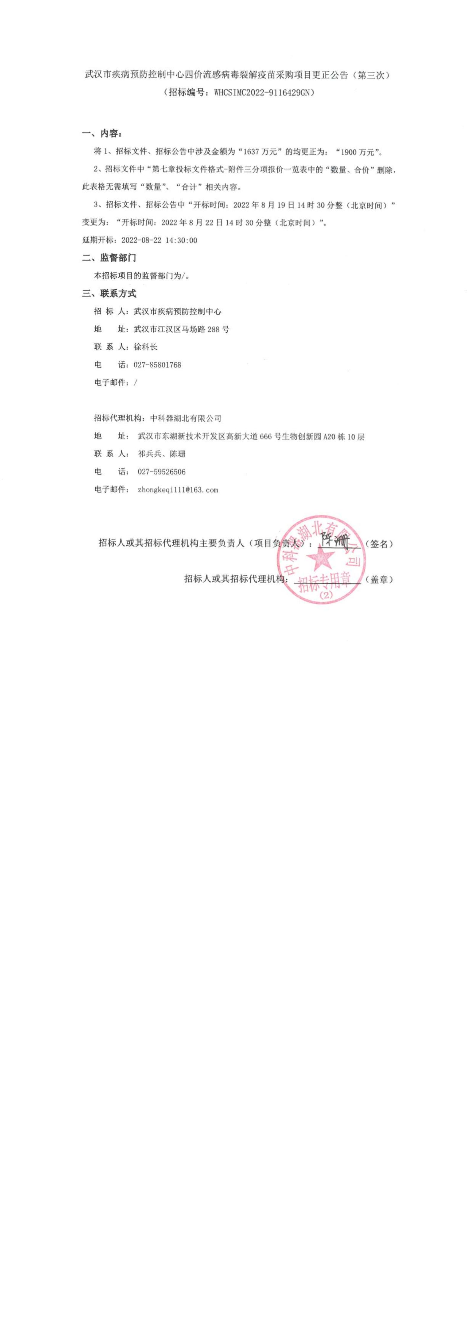 【武汉市疾病预防控制中心】武汉市疾病预防控制中心四价流感病毒裂解疫苗采购项目更正公告(第三次)