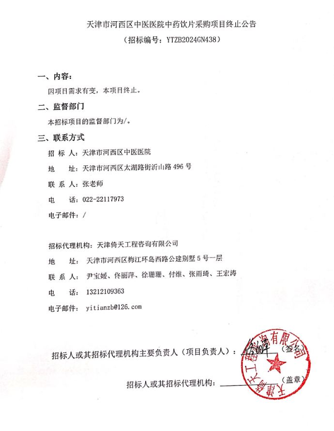 【天津市河西区中医医院】天津市河西区中医医院中药饮片采购项目终止公告