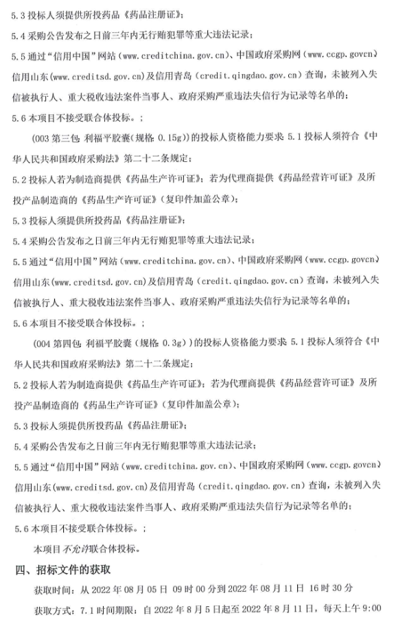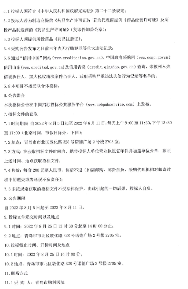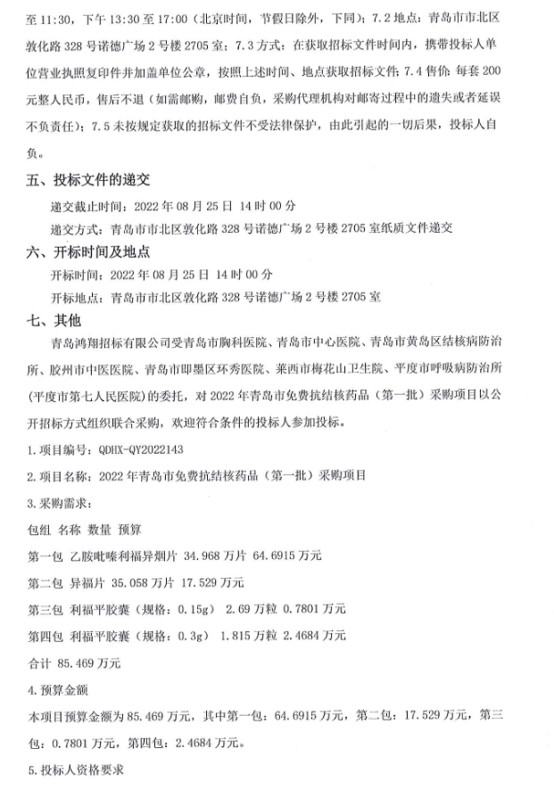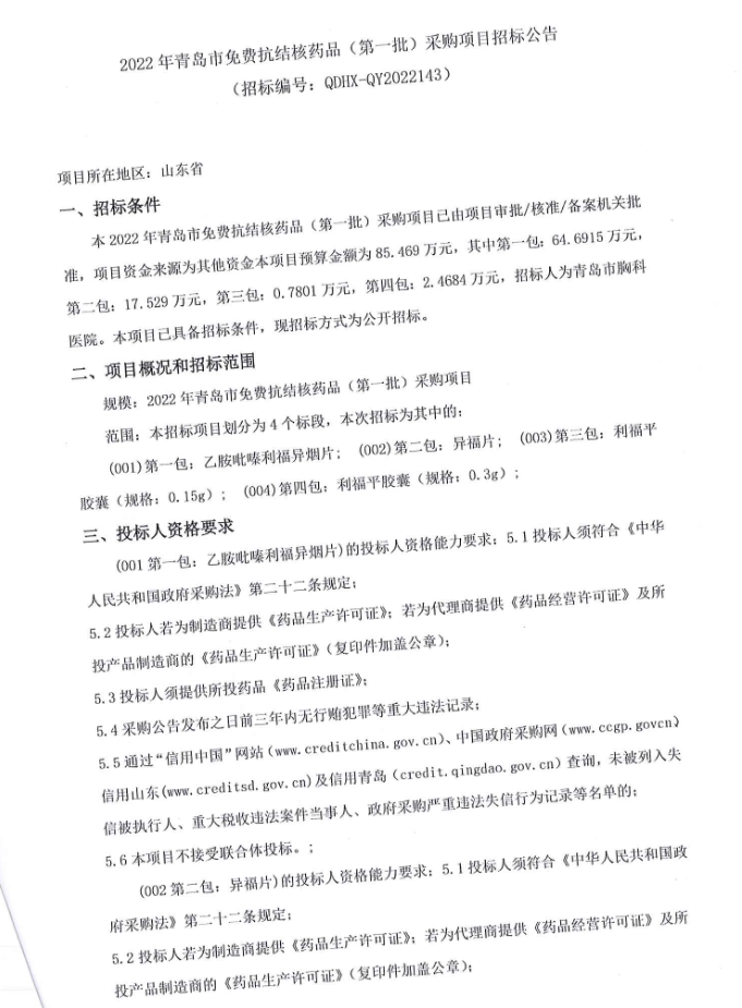 【青岛市胸科医院】2022年青岛市免费抗结核药品(第一批)采购招标公告