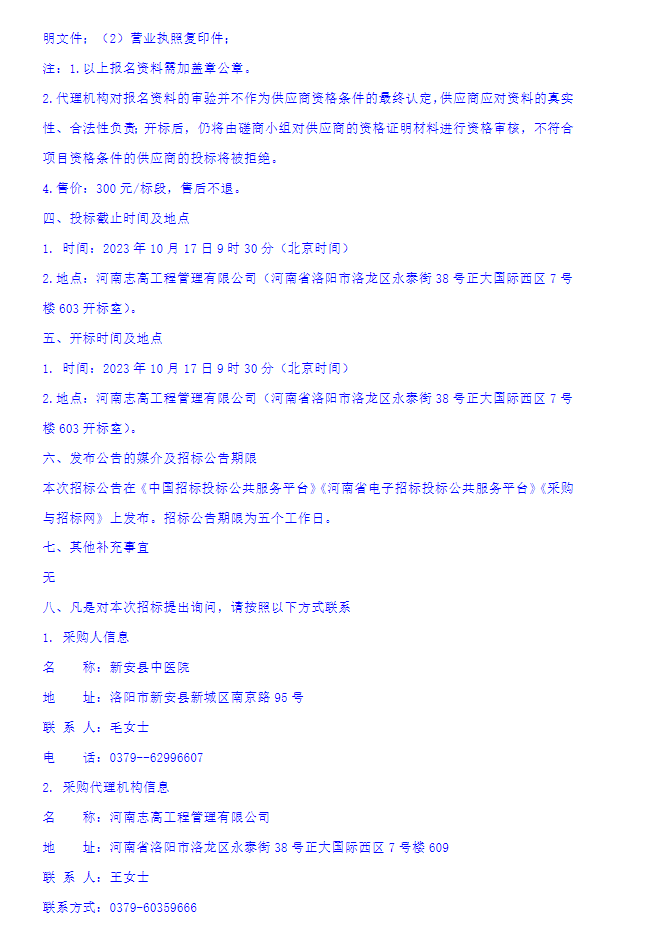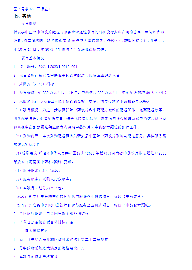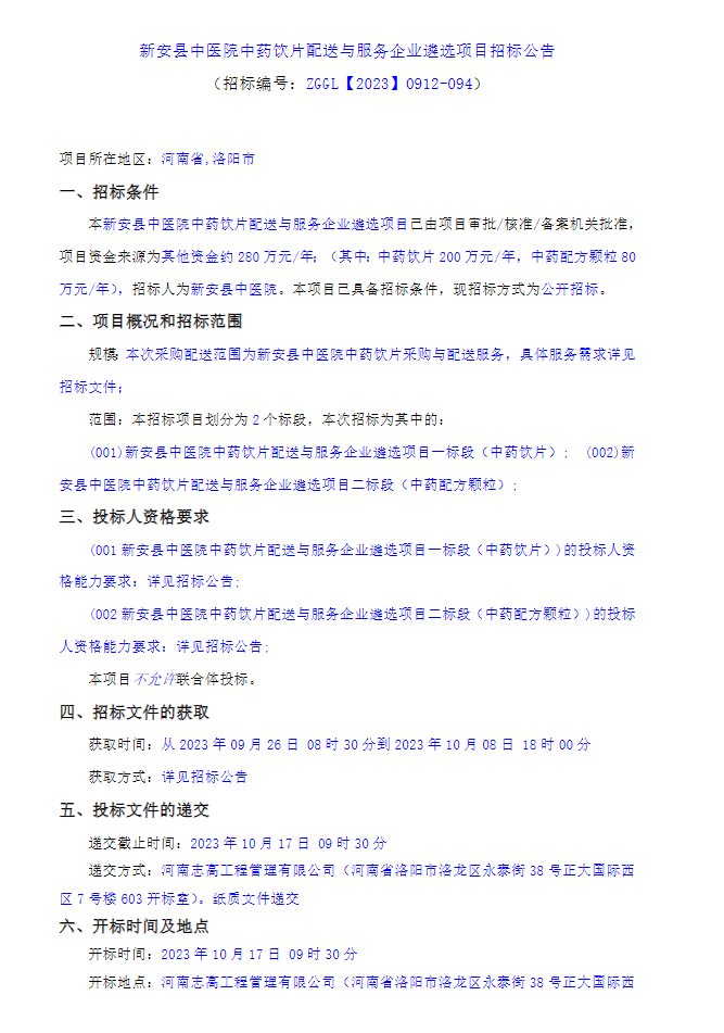 【洛阳市新安县中医院】河南省洛阳市新安县中医院中药饮片配送与服务企业遴选项目招标公告