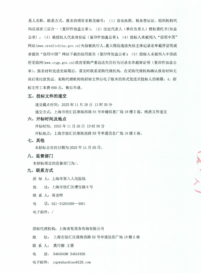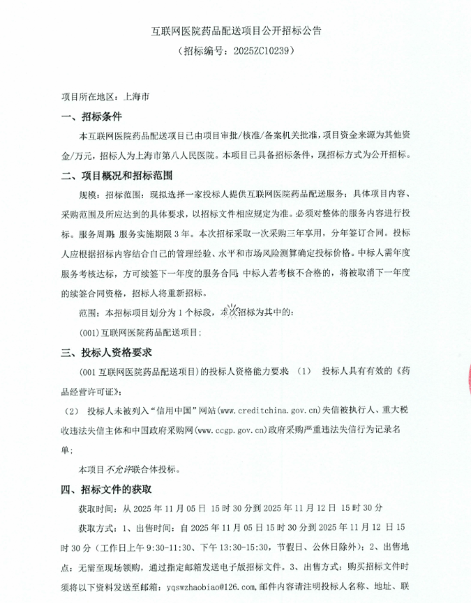 【上海市第八人民医院】上海市第八人民医院互联网医院药品配送项目公开招标公告