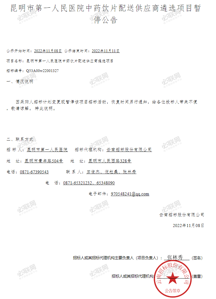 【昆明市第一人民医院】云南省昆明市第一人民医院中药饮片配送供应商遴选项目招标结果公告