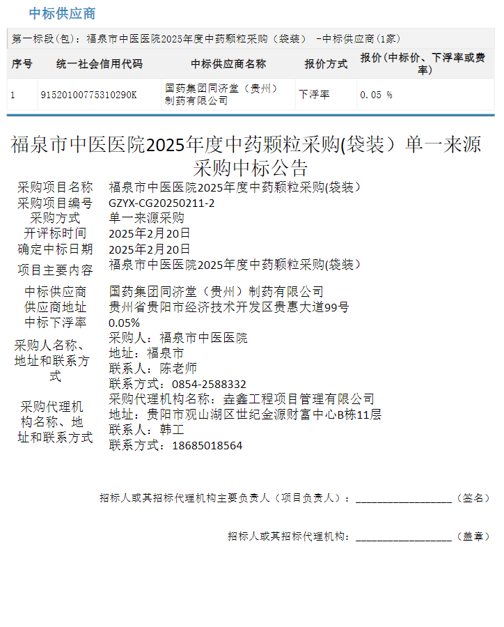 【黔南布依族苗族自治州福泉市中医医院】贵州省黔南布依族苗族自治州福泉市中医医院2025年度中药颗粒采购(袋装)单一来源采购中标公告