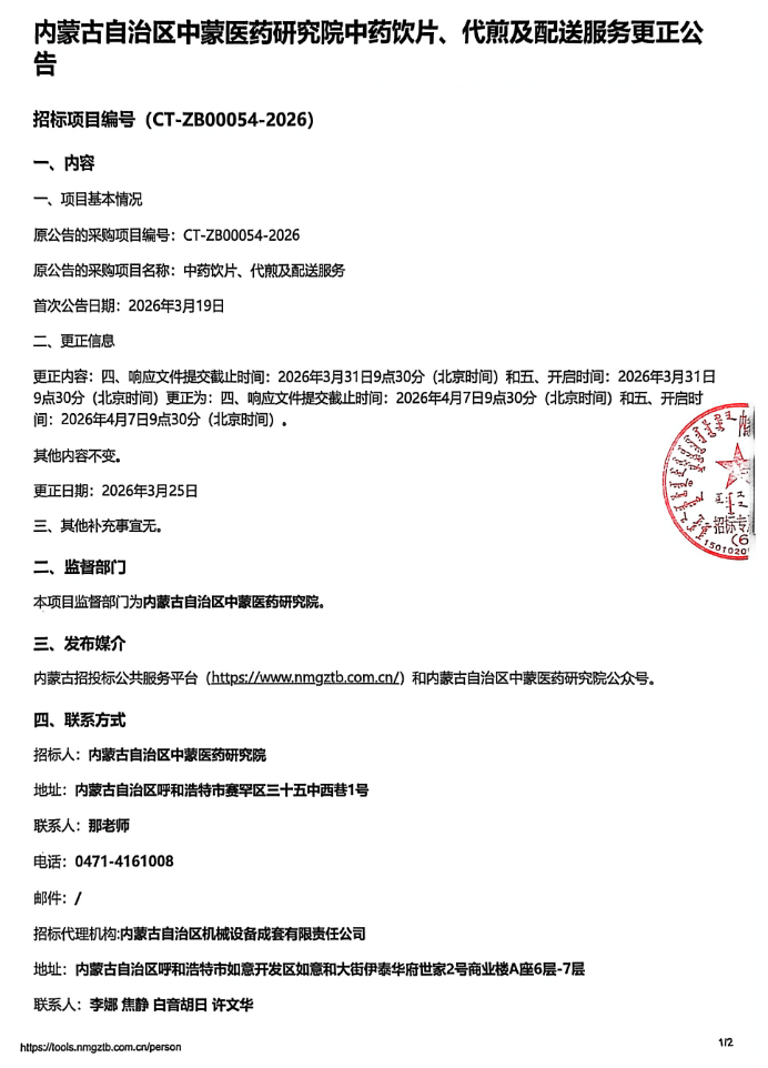 【内蒙古自治区中蒙医药研究院】内蒙古自治区中蒙医药研究院中药饮片、代煎及配送服务更正公告
