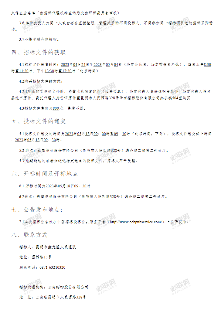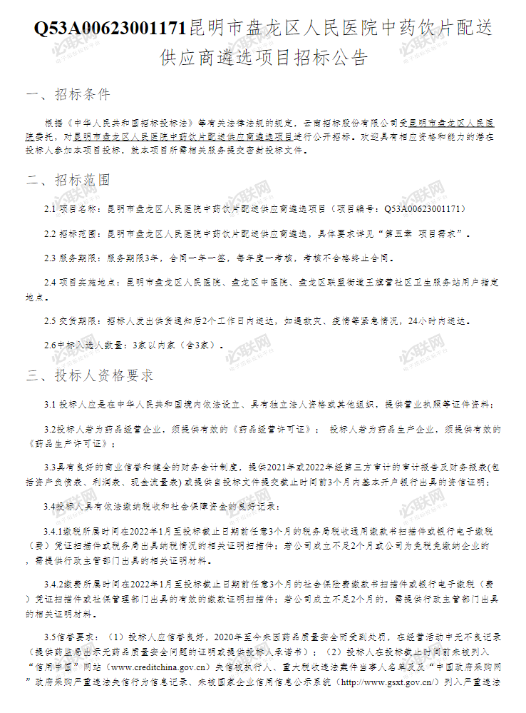 【昆明市盘龙区人民医院】云南省昆明市盘龙区人民医院中药饮片配送供应商遴选项目招标公告