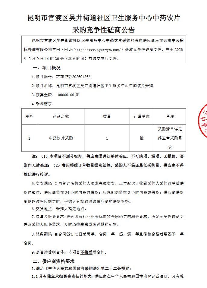 【昆明市官渡区吴井街道社区卫生服务中心】云南省昆明市官渡区吴井街道社区卫生服务中心中药饮片采购竞争性磋商公告