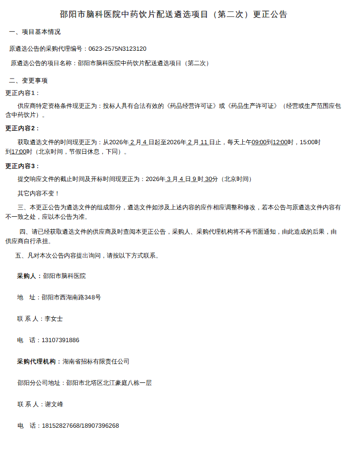 【邵阳市脑科医院】湖南省邵阳市脑科医院中药饮片配送遴选项目(第二次)更正公告