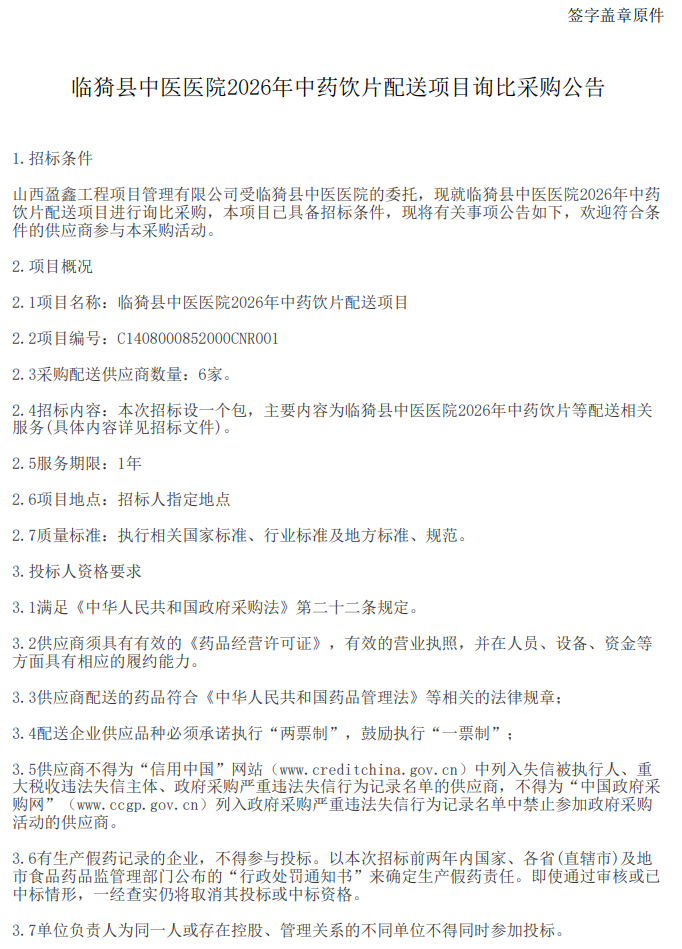 【运城市临猗县中医医院】山西省运城市临猗县中医医院2026年中药饮片配送项目询比采购公告