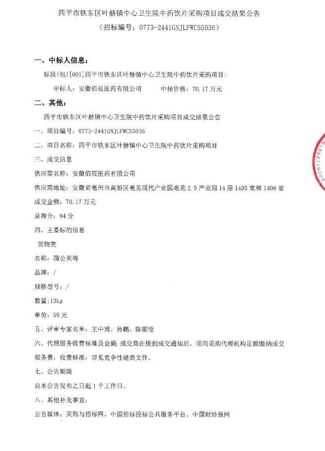 【四平市铁东区叶赫镇中心卫生院】吉林省四平市铁东区叶赫镇中心卫生院中药饮片采购项目成交结果公告