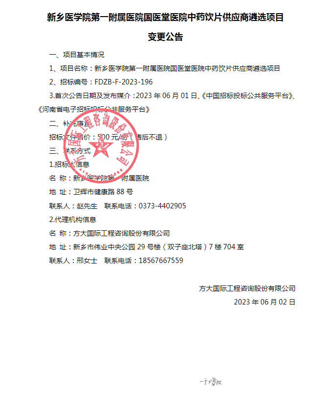 【新乡医学院第一附属医院国医堂医院】河南省新乡医学院第一附属医院国医堂医院中药饮片供应商遴选项目-变更公告