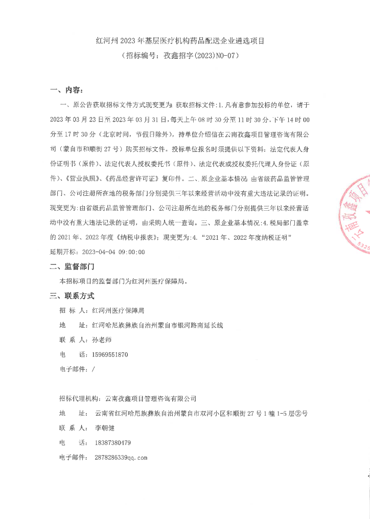 【红河州医疗保障局】云南省红河州2023年基层医疗机构药品配送企业遴选项目(20230327)