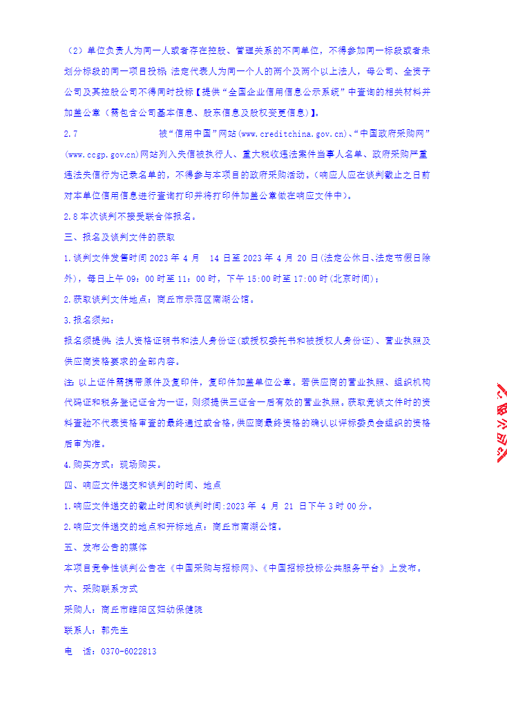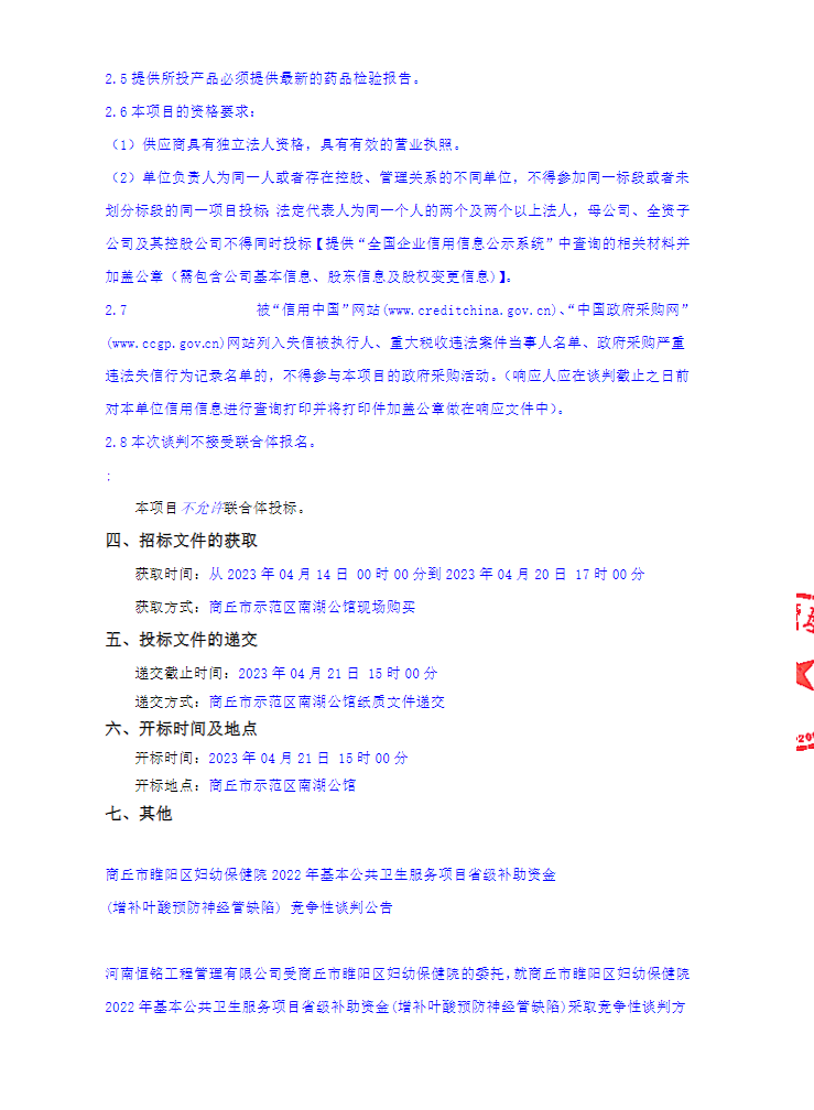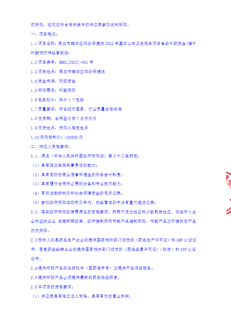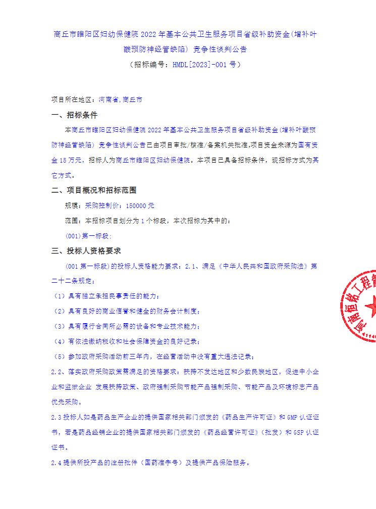 【商丘市睢阳区妇幼保健院】河南省商丘市睢阳区妇幼保健院2022年基本公共卫生服务项目省级补助资金(增补叶酸预防神经管缺陷)竞争性谈判公告