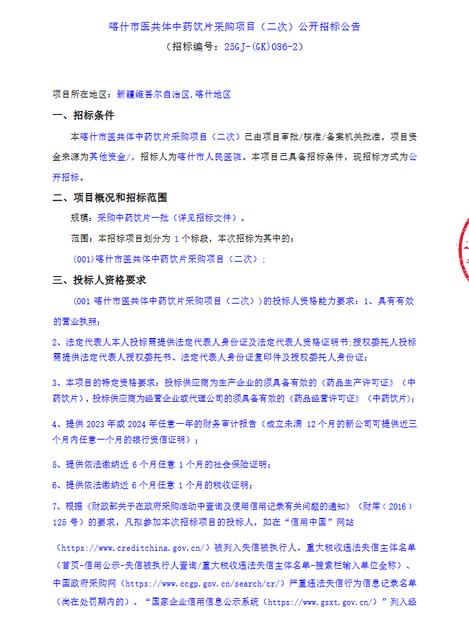 【喀什市人民医院】新疆维吾尔自治区喀什市医共体中药饮片采购项目(二次)公开招标公告