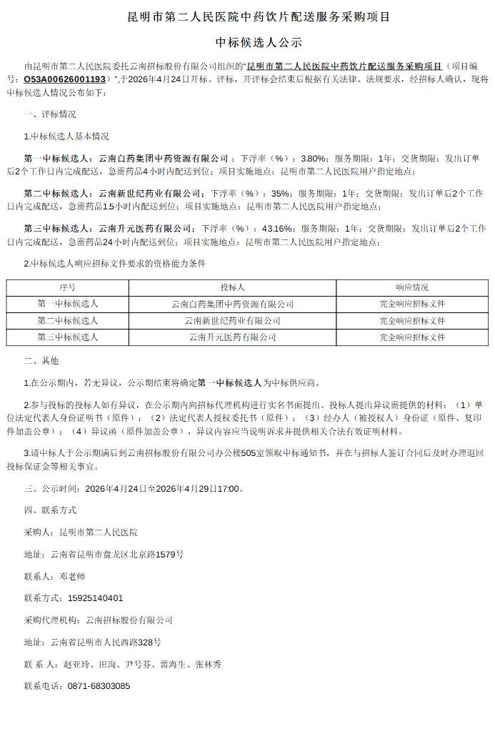【昆明市第二人民医院】云南省昆明市第二人民医院中药饮片配送服务采购项目中标候选人公示